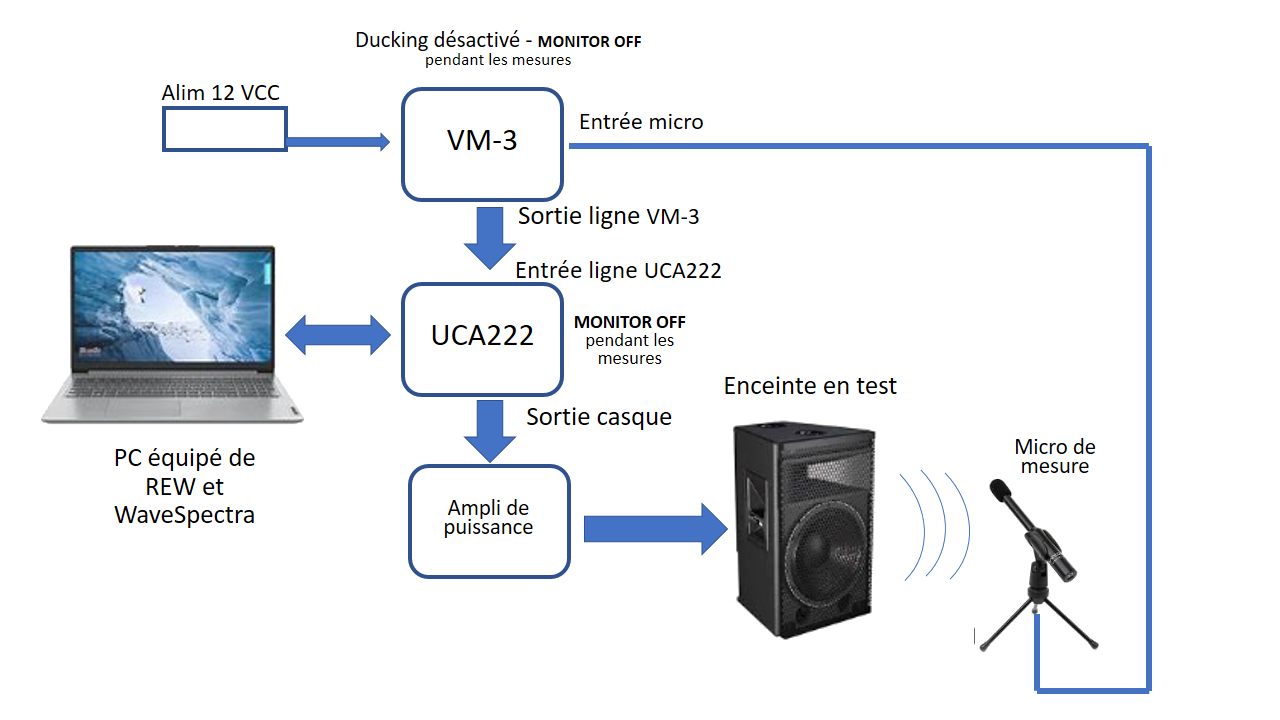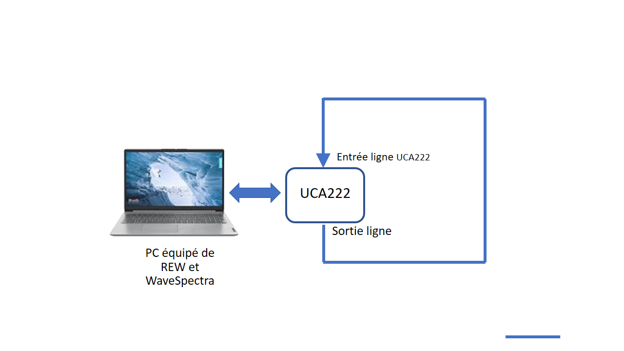 Avant de cliquer sur "Start" dans REW ou WaveSpectra : Vérifiez bien que le volume de sortie de UCA222 (action molette) est presque au minimum.
