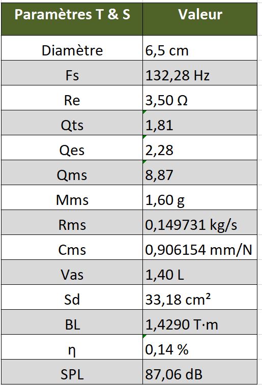 LIMP de la suite ARTA j'ai pu déterminer l'ensemble des paramètres Thiele and Small de ces HP, dont les caractéristiques électromécaniques sont celles du tableau de droite.